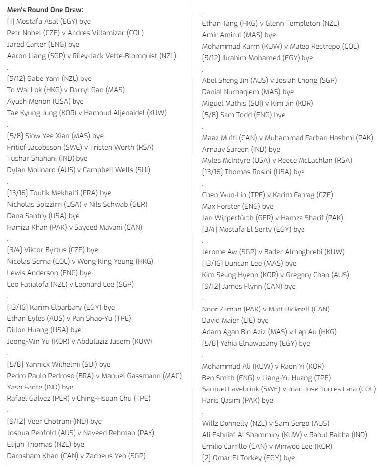 Hamza Khan will play against Sayeed Mavani of Canada in the first round. Naveed Rehman is up against Joshua Penfold of Australia. Farhan Hashmi will be facing Maaz Mufti of Canada. Noor Zaman is drawn against Matt Bicknell of Canada.