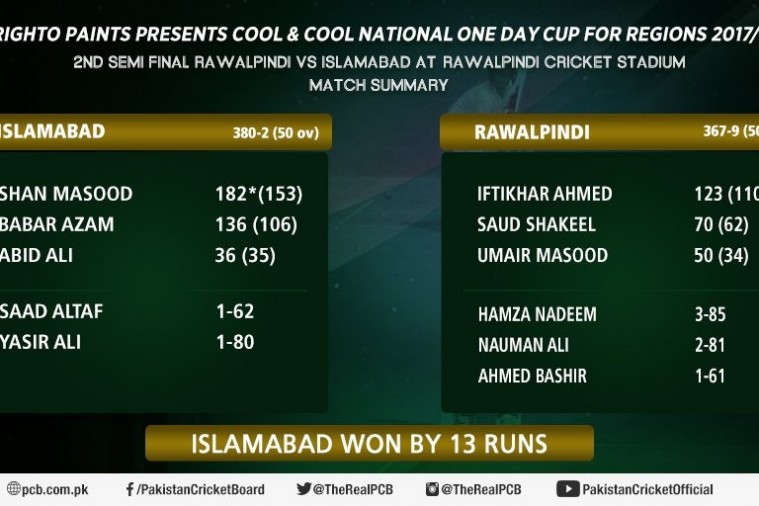 National One Day Cup for Regions Rawalpindi Cricket StadiumRawalpindi captain Mohammad Hafeez won the toss and put Islamabad to bat first in the second semifinal. Islamabad posted a huge total of 380 runs for the loss of only 2 wickets on the board, courtesy skipper Shan Masood’s unbeaten 182 runs while Babar Azam played a knock of 136 runs.
