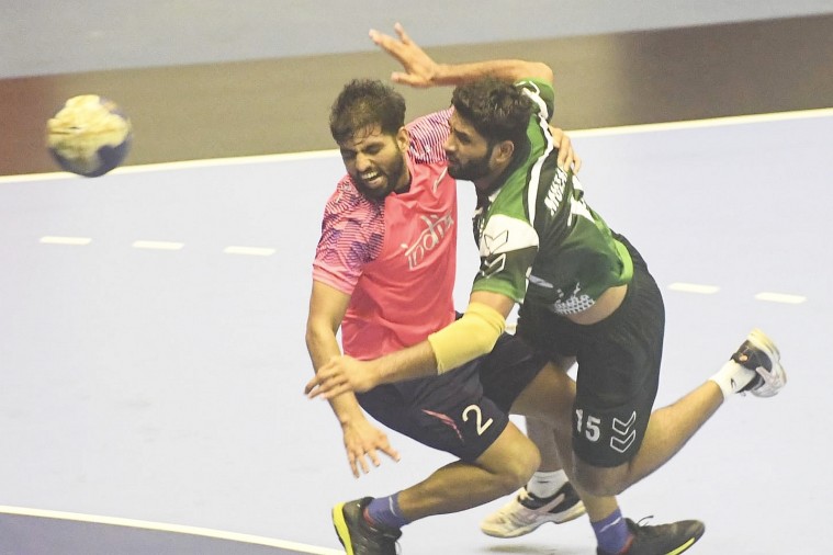 Regrouped and inspired for a victory, Pakistan started the 2nd half at the high note as they leveled the score at 14-14 from two goals down, and again at 16-16 to further snatch the lead at 17-16. Team india managed to equalize the scores at 17, 18 and 19-all with some heroics from Greenidge Dcunha of india, who also remained the top scorer of the match with 9 goals. The game for domination continued as both teams tried to take a lead but found the opponents leveling the scores as the score line moved from 20-all to 24-all in the 50th minute. india managed to get a two points lead at 24-26 and later at 25-27 in the 58th minute. A time out from Pakistan did the trick as Pakistan once again leveled the score one last time at 27-27 in the final minute. with a fast break from Hasrat Hussain. With india in possession of the ball and only 37 seconds remaining on the watch, india took a time out to get their act together. Coming out of the time out, Naveen Punia scored the final goal for india with just 13 seconds remaining in the game. Team Pakistan had a one last chance when Asim Saeed missed a 9meter shot at the goal.