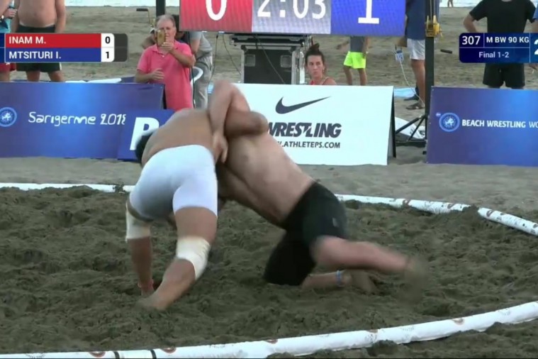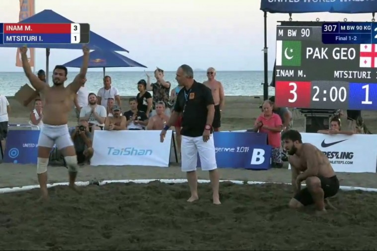 It took Inam only a minute to wrap up the fight as he claimed the Gold with a 4-1 "Victory by Fall". Inam entered the ring with an aggressive attitude and gave away an easy point in the hustle at the beginning with a ground touch. Watch the video of the Final Below as Muhammad Inam won the Gold at the World Beach Championship in Sarigerme, Turkey.