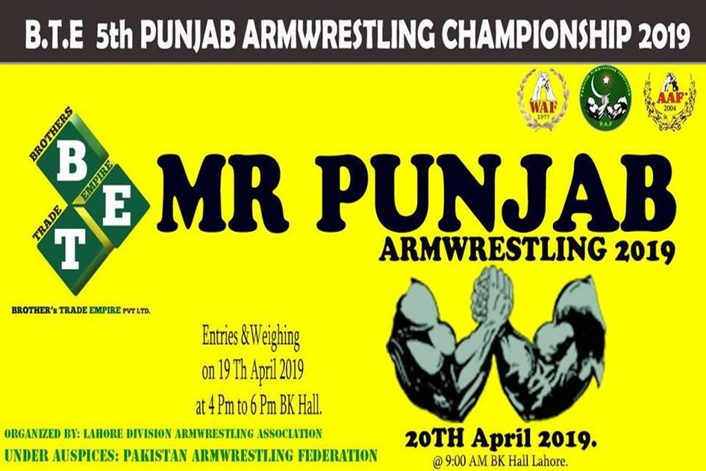 The 5th edition of Punjab Arm Wrestling Championship will be organized by Lahore Division Arm Wrestling Association under the auspices of Pakistan Arm Wrestling Federation (PAF) that will feature several talented arm wrestlers who will be participating this this one-day championship to show case their talent and compete against each other with giving their best so as to earn top honors in the championship.