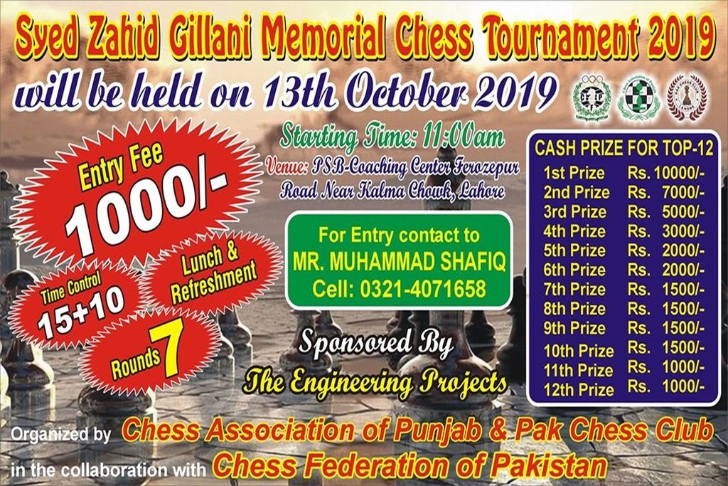 Noticeable number of chess players are expected to part take in theSyed Zahid Gillani Memorial Chess Tournament 2019 (National Rated) which is scheduled to be held on 13th October at PSB Coaching Center in Lahore.