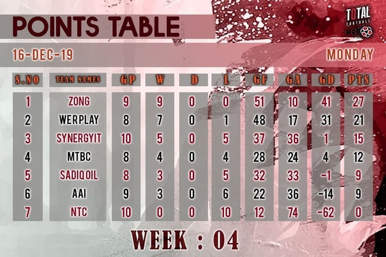 Total Football Corporate League 2019 Total Football GroundThe fourth week of the tournament concluded with Zong team sitting atop the first position just like the end of the third week while Sadiq Oil team's fall in performance caused them to lose their 4th position and now they sit at the 5th after the end of the fourth week matches.