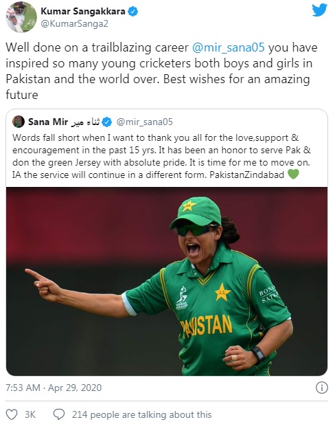 Sri Lankan legend Kumar Sangakkara paid homage to recently retired Pakistan Women all-rounder Sana Mir, calling her a trailblazer and a source of inspiration for both the gender.