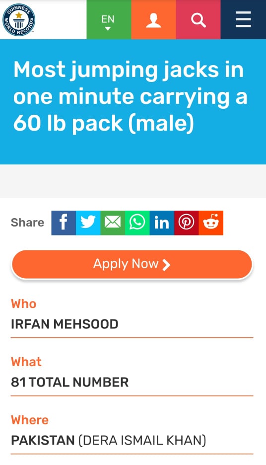 Irfan Mehsood has achieved his 33rd Guinness World Record by setting the latest of the most jumping jacks (81) in one minute carrying a 60-lb pack. He is the first player in the world to set this record.