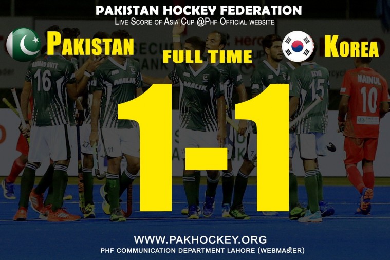 Pakistan played a draw match 1-1 against defending champions Korea today in the 10th edition of the men Asia Cup hockey tournament at Moulana Bhashani Maulana Bhashani Hockey Stadium Dhaka.