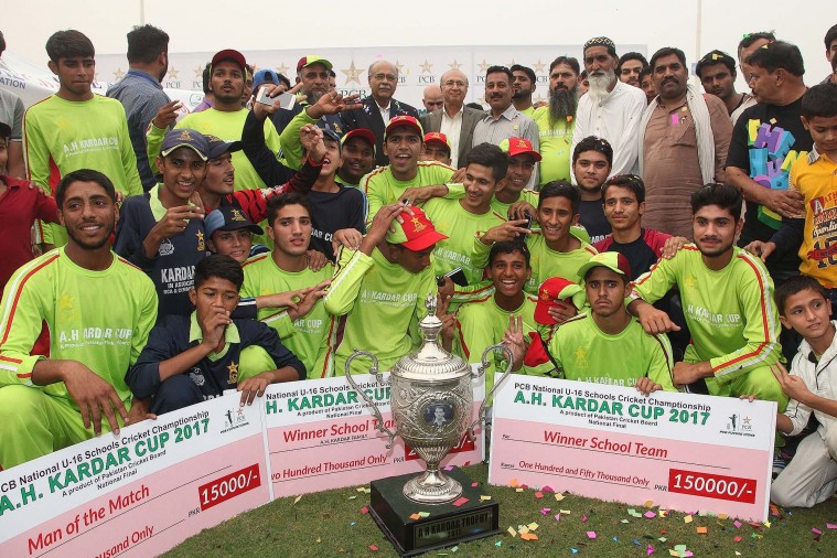 Qila Lachman Singh team after defeating Al-Fatima School, won the A.H.Kardar Under-16 cricket championship played at Qaddafi Stadium Lahore.