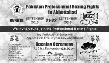 As many as 58 pugilists are to compete in 2019 Abbottabad Professional Boxing Fight Night 2019 which is scheduled to be contested from 21 to 22 September at Nawanshehr, Abbottabad.