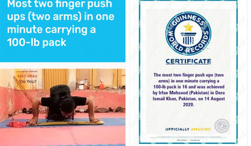 Irfan Mehsood, who hails from South Waziristan, has clinched this Guinness World Record after he completed 16 push-ups on fingertips while carrying 100-lb on his back in 60 seconds.