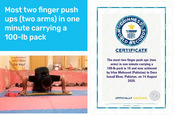 Pakistani martial artist, Irfan Mehsood, has registered his 34th Guinness World Record with the latest record of doing 49 push-ups with the finger tips and carrying a 60-lb pack in one minute.