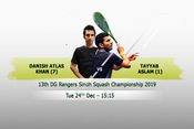 Tayyab Aslam defeated Waqas Mehboob 3-1 in their semifinal of the 13th DG Rangers Sindh Squash Championship 2019 at Sindh Rangers Jahangir Khan Squash Complex, Karachi.